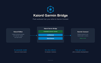 Kaiord Garmin Bridge är en gratis webbläsartillägg som förenklar överföringen av träningspass från Kaiord workout editor till Garmin Connect. Med hjälp av denna tillägg kan användare skicka strukturerade träningspass direkt till sin Garmin Connect-profil utan att behöva ange några lösenord eller API-nycklar. Det fungerar genom att använda den aktiva inloggningen till Garmin Connect, vilket gör processen smidig och säker.